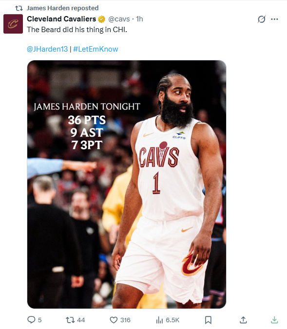 本场36分的个东谈主得分哈登创下加盟骑士后的单场得分新高。
