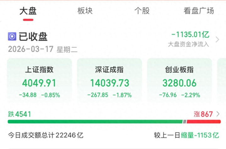 3月17日,A股冲高回落,三大指数集体下落,市集赢利效应再次跌入冰点,板块和个股迢遥收跌,不及900只个股飘红,保障、券商和银行等少数板块飞腾,芯片、军工和新动力车板块领跌。