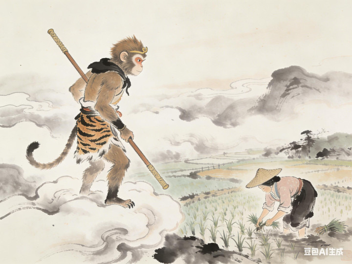 孙悟空站在云表,看着黎山老母在田间劳苦的身影,喃喃自语:"姐姐,俺老孙服了。"