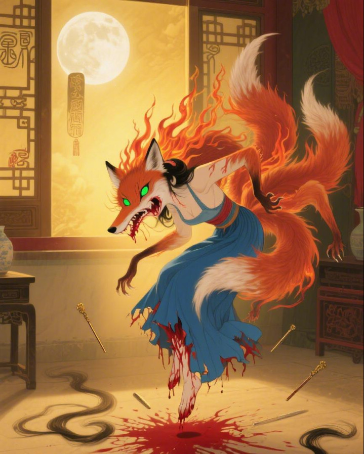 吴秀兰尖叫一声,在金光中悲凉地扭动,头发散开,面貌误解,渐渐现出原形——竟是一只通体火红的狐狸,有六条尾巴,眼中闪着幽绿的光,嘴角还挂着鲜血。