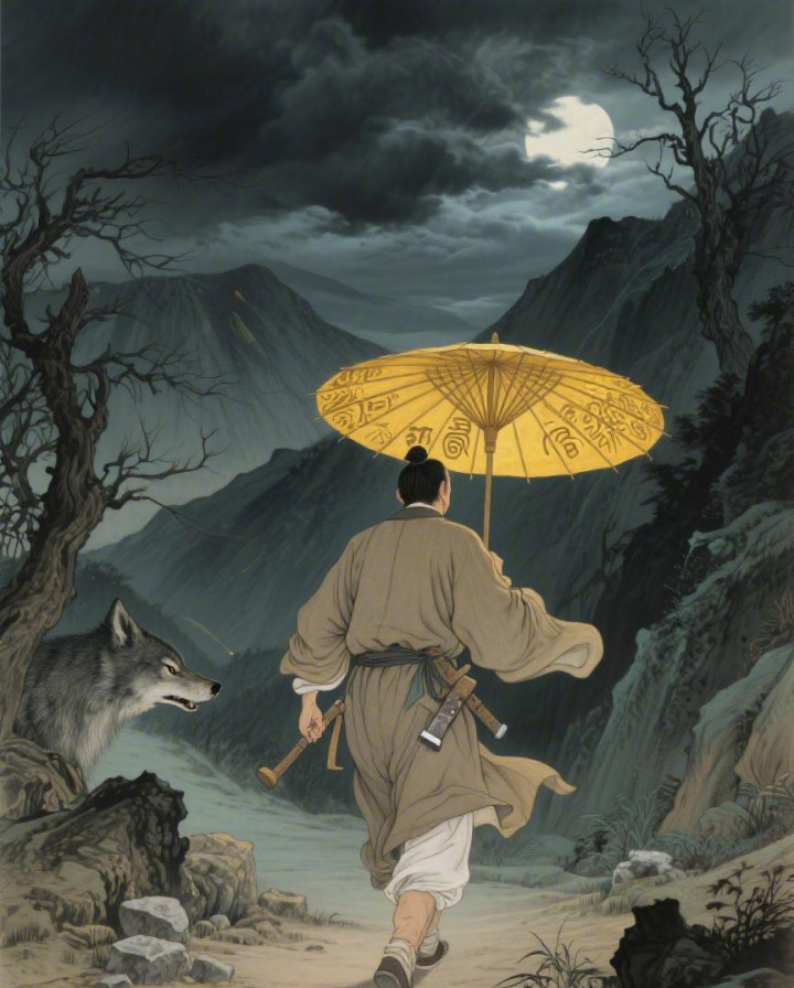 走到野狼岭半腰,天也曾黑透了。月亮被乌云遮住,伸手不见五指。周大壮大开陈寡妇送的那把油纸伞,挡在头顶。伞面是深黄色的,画着一些奇怪的标记,他以前没提防过。