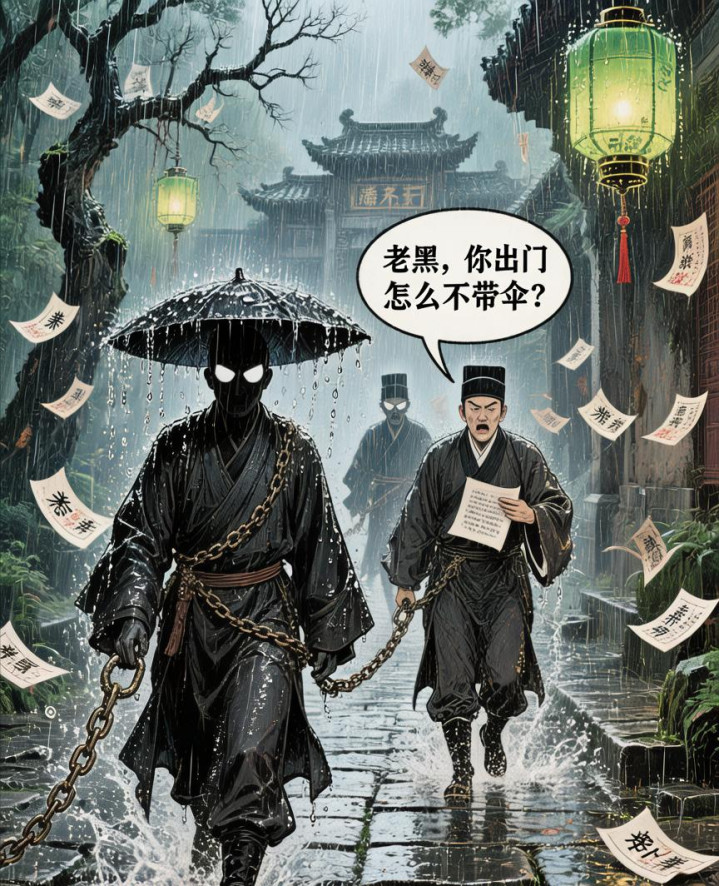 黑无常在前边带路,白无常押着他在背面走。走了没多远,天上忽然下起大雨。雨点又大又急,砸在地上啪啪响。白无常挟恨说念:“老黑,你外出若何不带伞?这雨下得邪乎,淋湿了且归若何见阎王?”