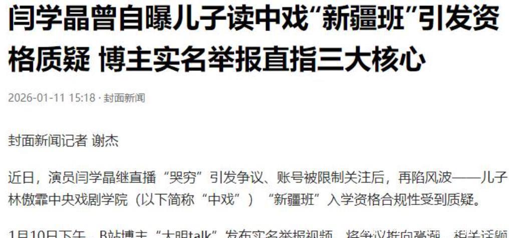 共享只为述说问题黄金城,淌若实践不如你意,也请你不要较真,感性看待问题。 本文信息溯源:事件启事(2025年12月29日闫学晶直播言论):概括自本日直播片断的网罗传播及后续多家媒体的报谈综述。平台经管与品牌解约(2026年1月10-11日):依据闫学晶在抖音、快手平台个东谈主账号主页的及时情状,以及“佐香园”、“统厨”品牌方发布的官方声明或对《南边都市报》等媒体的公开表态。B站博主“大明talk”实名举报及“三宗罪”质疑重心:基于该博主于2026年1月上旬在B站平台发布的实名举报视频实践,畸形晒出的向讲授部门提交材料的回执。举报实践中枢围绕林傲霏考入中央戏剧学院“新疆班”的经验合规性问题伸开。