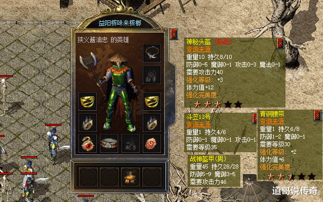 第二,衣饰四件套这位战士英雄缺了靴子和勋章,不知谈是不是拿去强化了呢?我们先望望穿搭的四件套:神秘装备在改版之后能平直看见属性,也算是一件乐事。如上图所示,黄金城神秘头盔是防护5魔御1攻3魔1的属性,比拟优秀;全属性笠帽现阶段也可以;青铜腰带是次顶级系列;战神盔甲仅仅过渡,品级充足了,天魔神甲就不远了。