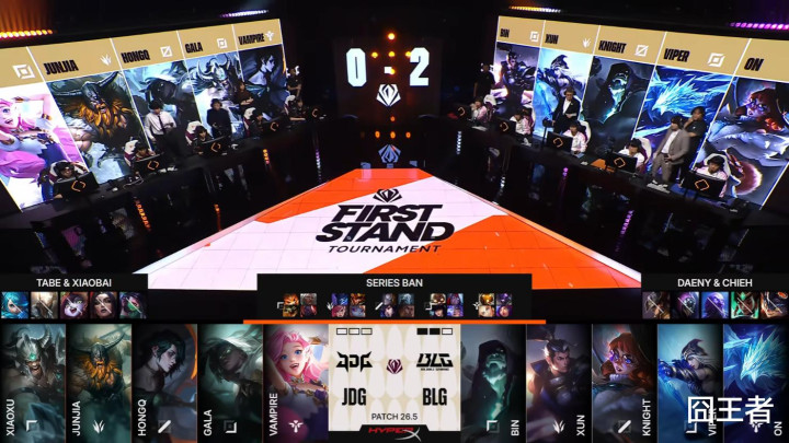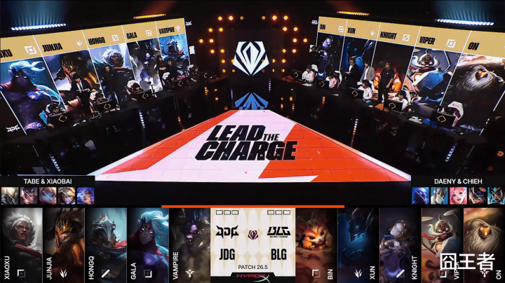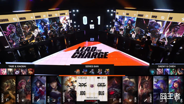 第一局比赛,J DG蓝色方,禁用:潘森、赵信、波比、伊泽瑞尔、芸阿娜,采取:Xiaoxu安蓓萨、Junjia皇子、HongQ维克托、GALA韦鲁斯、Vampire毒头;B LG红色方,禁用:瑞兹、加里奥、萨勒芬妮、兰博、卡尔玛,采取:Bin纳尔、Xun梦魇、knight发条、Viper飞机、ON巴德