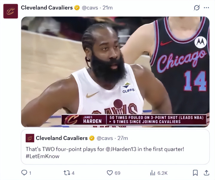 哈登照旧在三分线外制造50次3+1领跑定约,他到来骑士后照旧制造了9次3+1,此役上半场就两个3+1。
