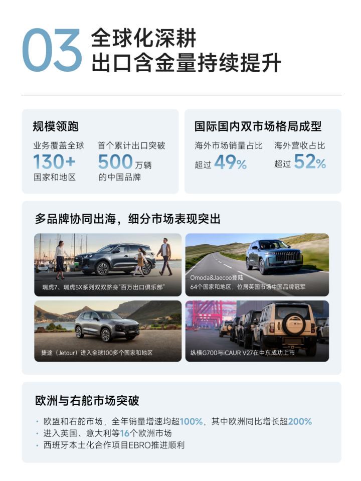 在人人汽车产业向新能源时期迈进的激流中,中国自主品牌的出海征途正履历着一场深刻的“质变”。近日,奇瑞汽车发布的2025年齿迹公告揭示了一个令东说念主正经标亮点:其全年新能源汽车出口销量同比增幅卓著500%的里程碑。这一指数级增长的背后,并非浅近的市集红利拿获,而是一场由技能适配与市集知悉共同驱动的结构性变革。奇瑞正以一套独到的“双轨并行”技能玄学,在人人不同发展梯度的市集中,铺设出一条相反化的凯旋之路。