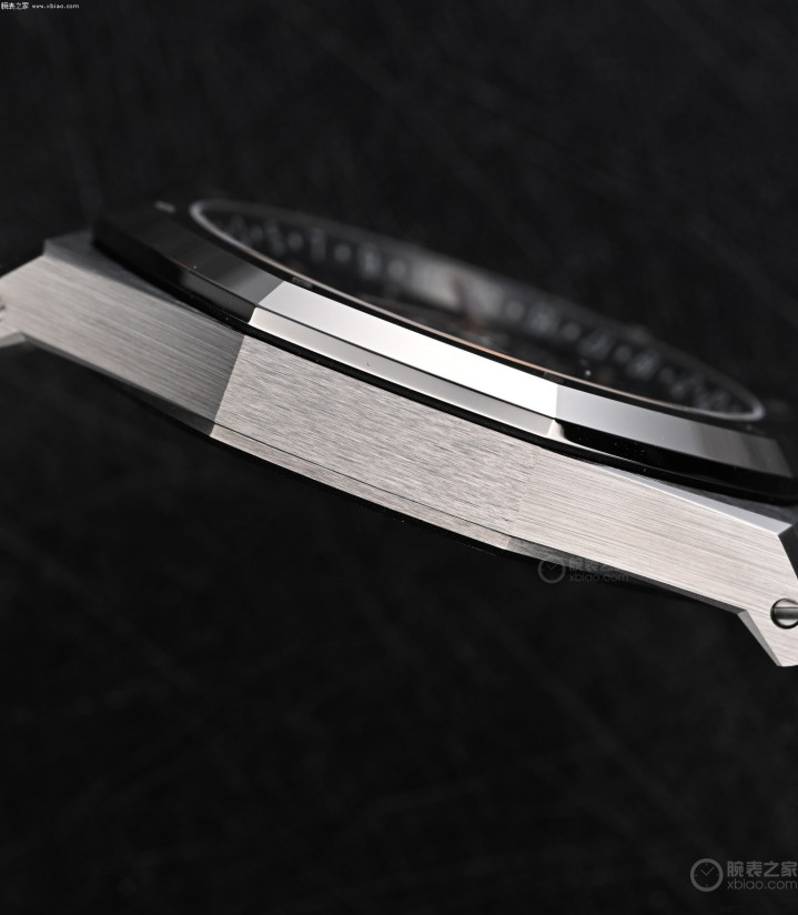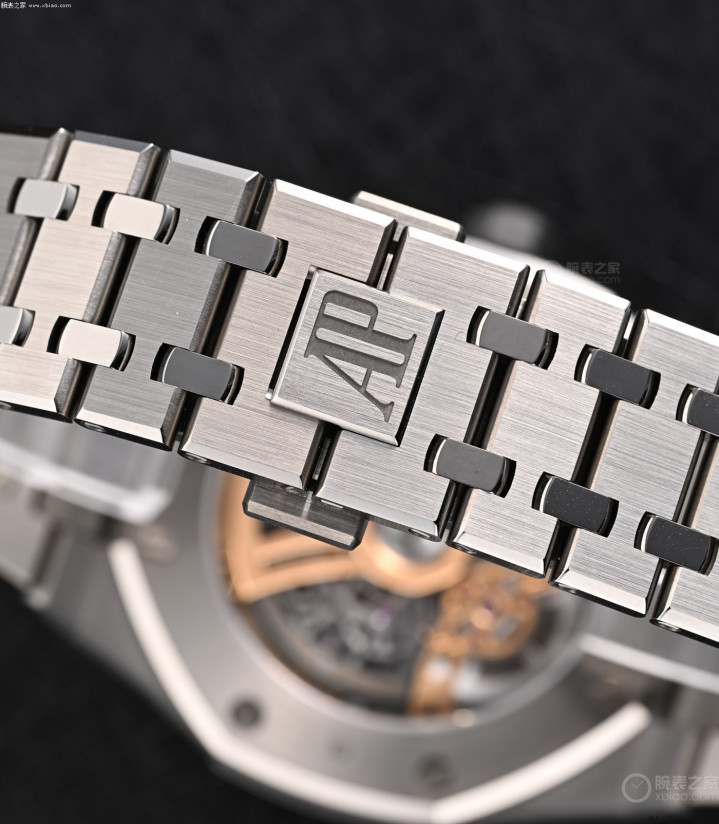 新款皇家橡树万年历26685镂空,尺寸和厚度,和成例款皇家橡树万年历26674一致(41毫米,厚9.5毫米),但镂空款的表壳材质,使用了钛金属,和金属玻璃的组合。钛金属表壳、钛金属表链,分量轻,适于指导,情有可原。而金属玻璃表圈,金属玻璃中段链节的使用,爱彼方面主淌若出于,亮度和硬度的考虑。