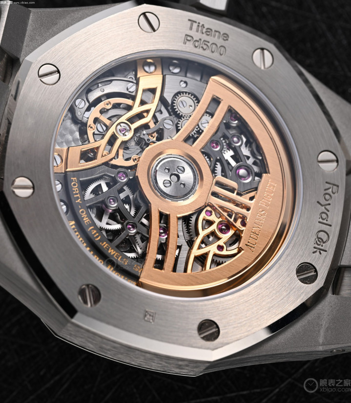 爱彼皇家橡树万年历26685镂空款,钛金属表壳,金属玻璃表圈,尺寸41毫米,厚9.5毫米,使用爱彼7139镂空万年历机芯,装备“万能表冠”,能源55小时,防水50米。